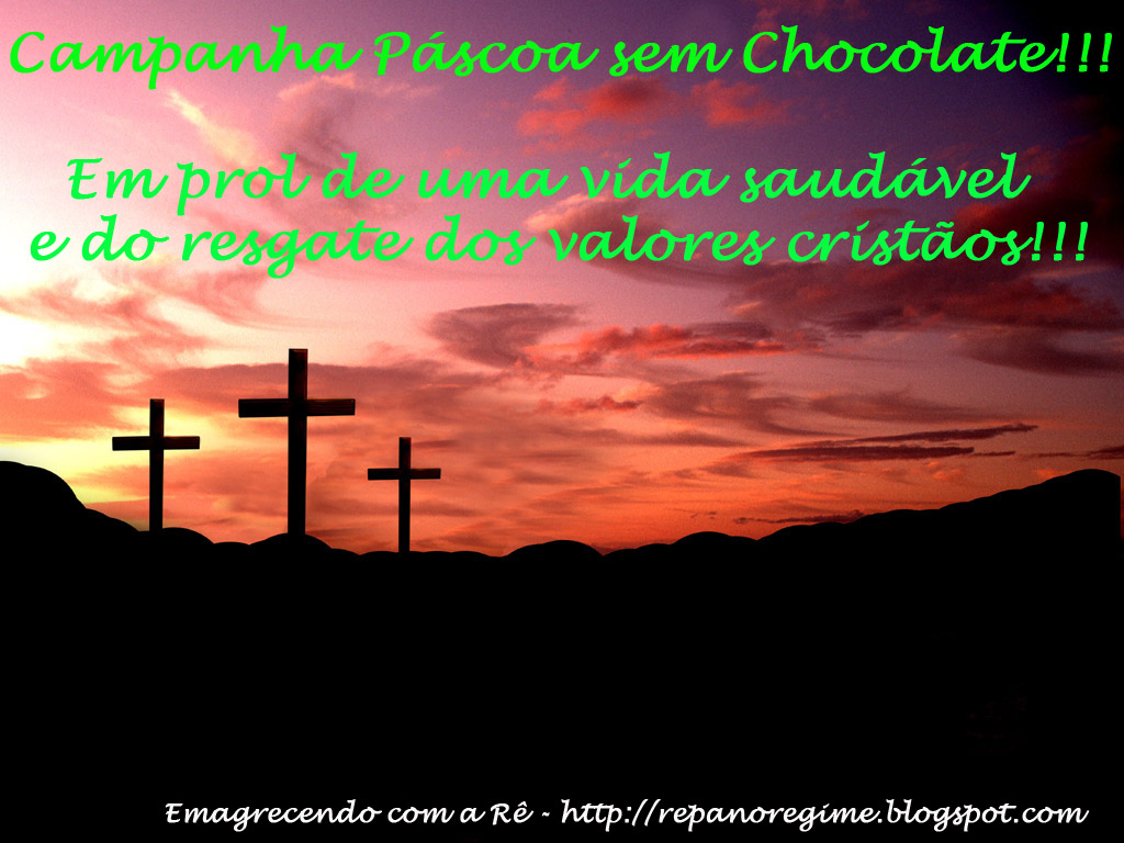 Hoje cedo enquanto preparava o café-da-manhã eu pensava num novo post e me veio essa idéia de criar uma "Campanha" para divulgar no face e publicar aqui, que eu denominei "Páscoa sem Chocolate", e pensando um pouquinho no real significado da data me veio o lema: em prol de uma vida saudável e do resgate dos valores cristãos!!!
